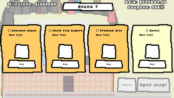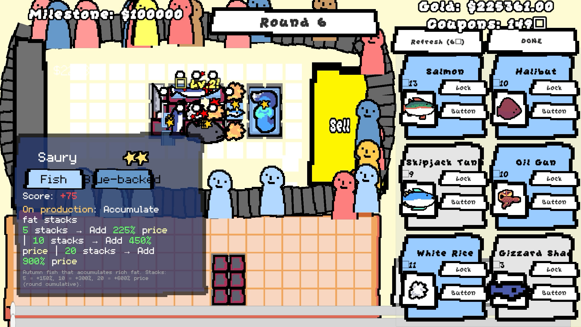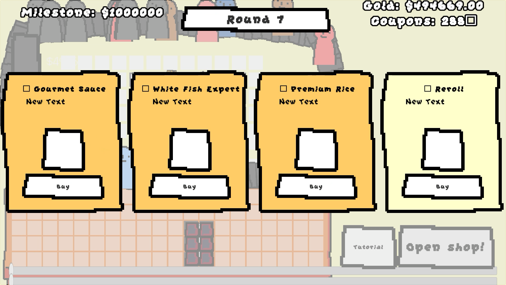 - Each sold plate grants coupons. Spend them in the shop; unused coupons earn 10% interest per round.